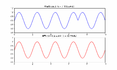 空間ミラー(青)のモデルでは、横軸が空間 を表し、波は左から右へ伝播し、ある位置(例: